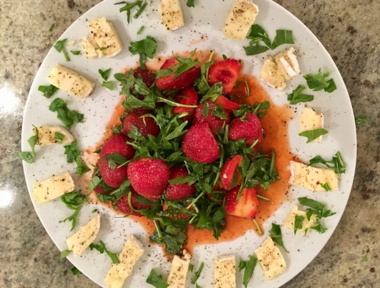 Erdbeeren in einer raffinierten Marinade aus Orangensaft, Olivenöl und Balsamico: Rezeptidee aus der französischen Küche. Und glaub mir: Unsere Nachbarn wissen echt, wie man Gaumen und Nase verwöhnt! Dazu gibt’s Käse und Baguette. Bon appétit ! (Und dass man Rucola mit einem c schreibt, hab ich jetzt auch gelernt ; )