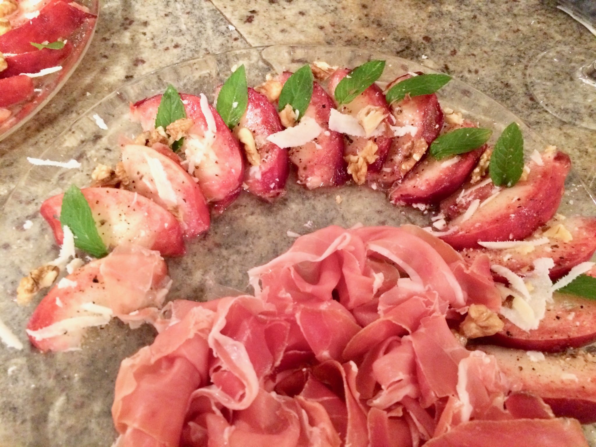 Deshalb gibt es im August nichts Besseres als ein feines Carpaccio aus Pfirsichen mit weißem Fleisch und dazu Schinken.